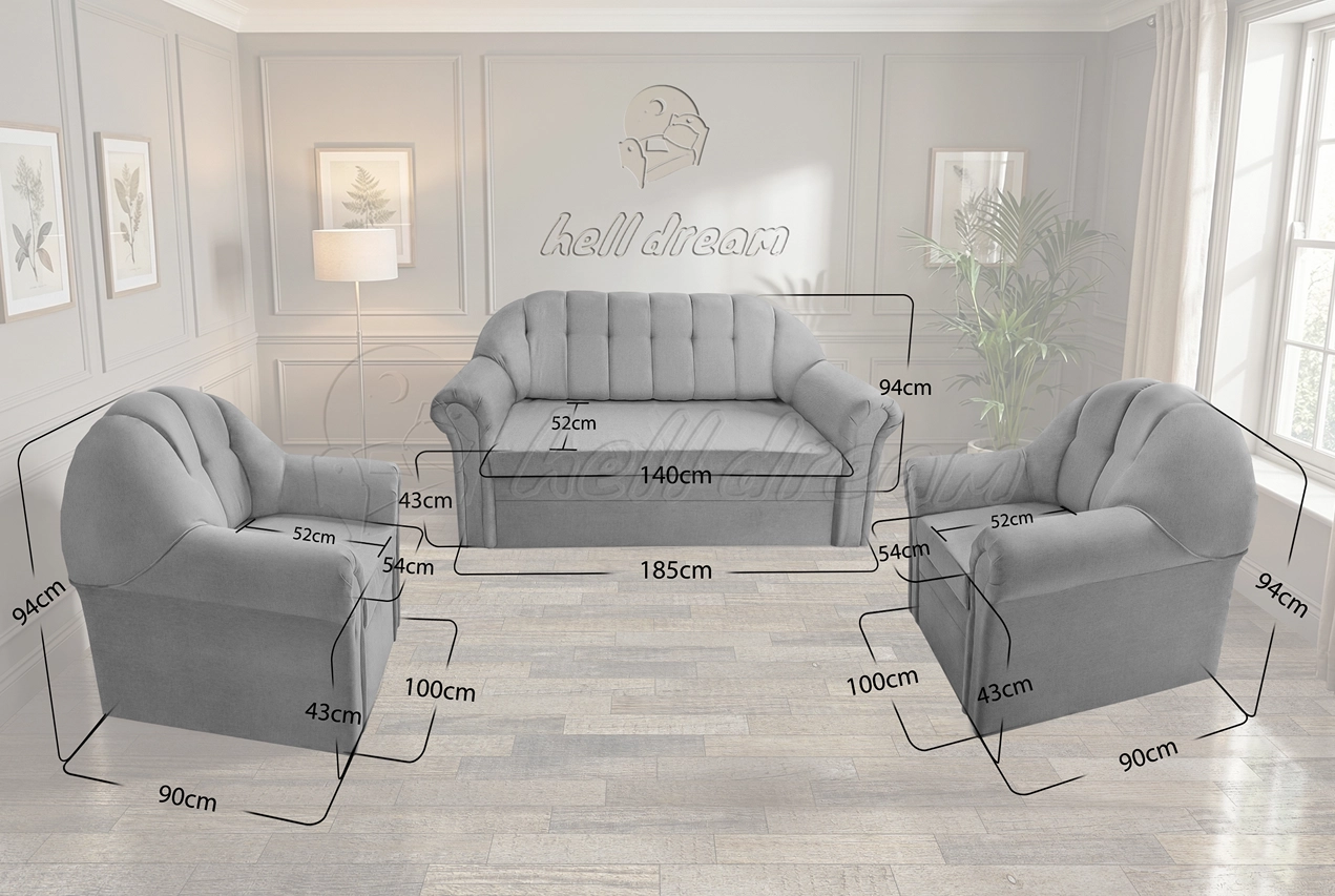 A garnitúra központi eleme a 3-as kanapé, amely ágyazható funkcióval rendelkezik, így néhány mozdulattal kényelmes fekvőhellyé alakítható. A beépített ágyneműtartó segít rendszerezni a plédeket, párnákat, takarókat, így mindig kéznél vannak, mégsem foglalnak extra helyet. A két fotel stabil tartást és kellemes üléskomfortot biztosít, tökéletes kiegészítői a kanapénak.