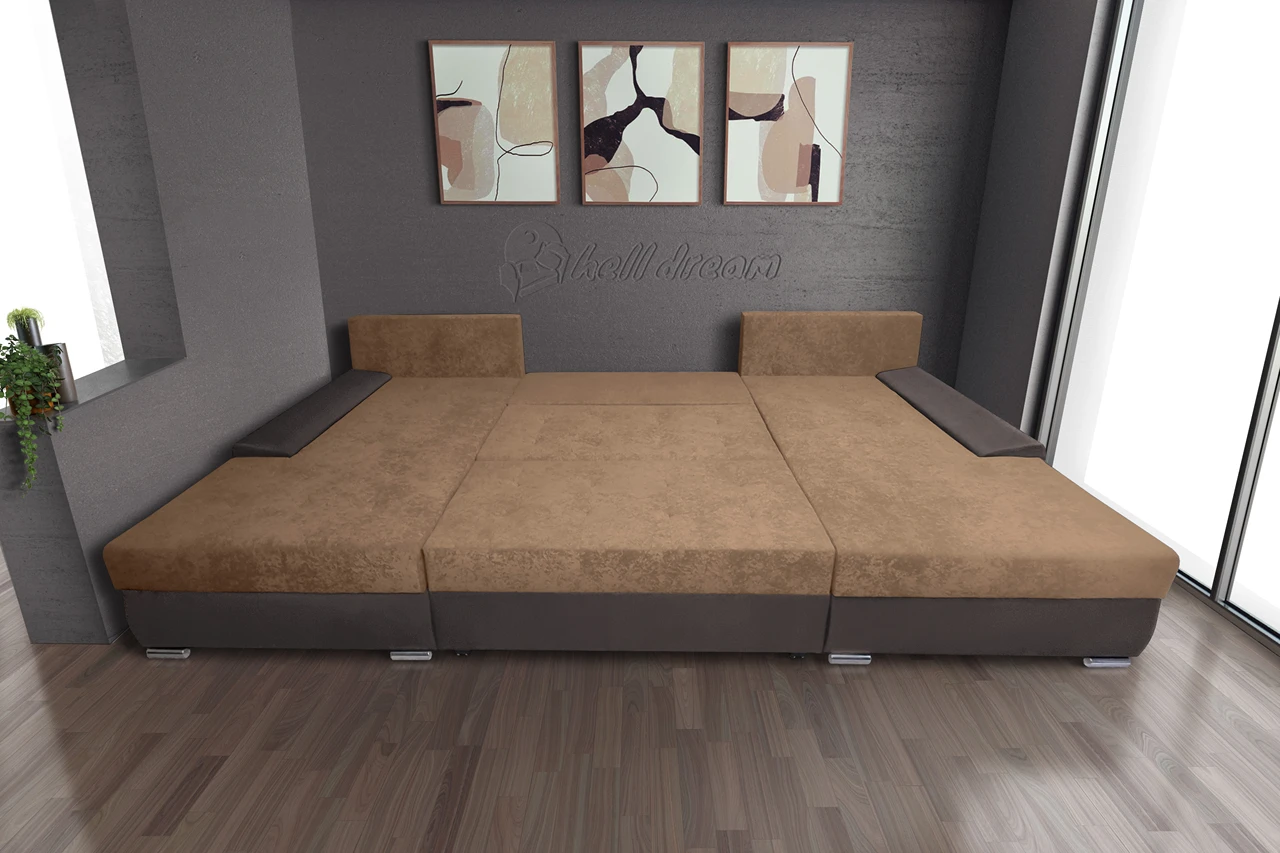 Wixy Giga u alakú kanapé mély földszürke és halvány taupe színben 405 x 225 cm fantasztikus nagy fekvőfelülettel